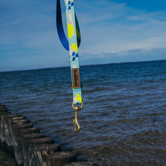 Stylisch, nachhaltig und funktional: Die Hundeleine La vie est belle Vamos a la Playa kombiniert grafische Highlights mit recycelten Materialien. Handgefertigt in Deutschland, vegan & pflegeleicht.